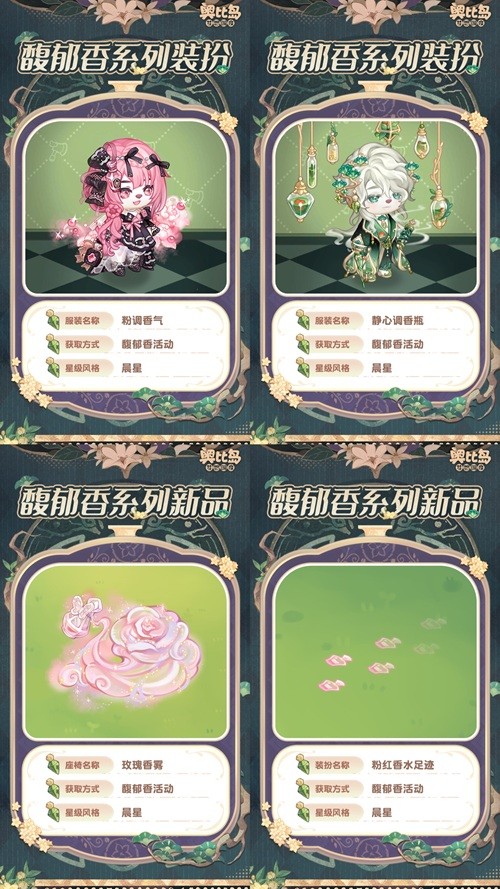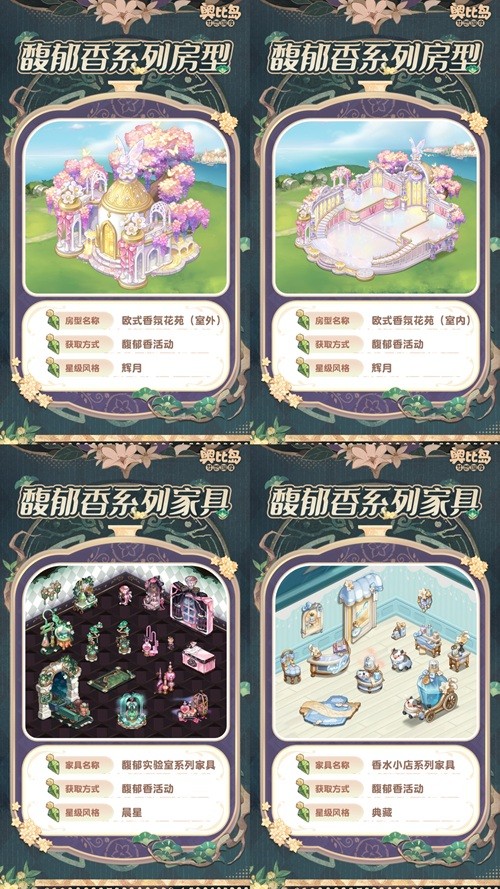 3月27日5:00-4月25日23:59期间,参与「馥郁香」限时活动,可获得活动限定奖励。奖励包括:辉月房型「欧式香氛花苑」,晨星装扮「璀璨芳华套装」「淡雅香韵套装」,典藏装扮「甜馨牧语套装」「元气橘光套装」,晨星家具「馥郁实验室系列」,典藏家具「香水小店系列」,还有双人座椅「玫瑰香雾」、幻光「粉红香水足迹」、单品「静心调香瓶」「粉调香气」、头像框「馥郁之香」、背景卡「香之印记背景」等惊喜礼物!