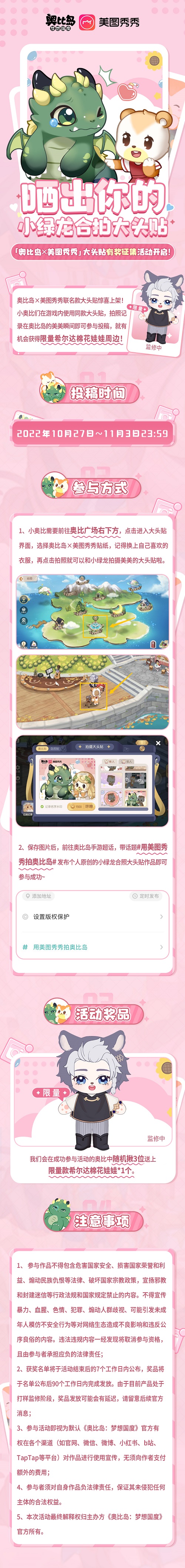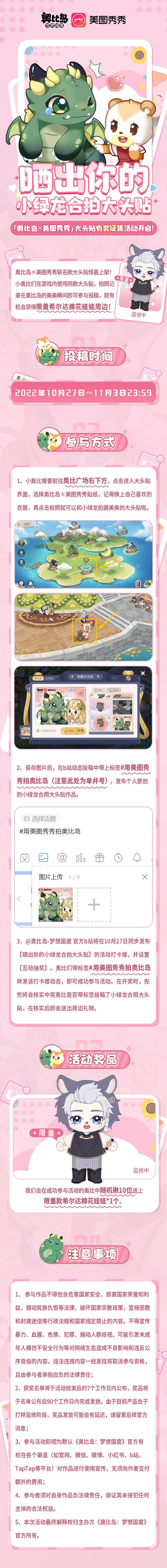 在B站动态投稿中带上标签#用美图秀秀拍奥比岛,发布个人原创的小绿龙合照大头贴作品即可参与。
