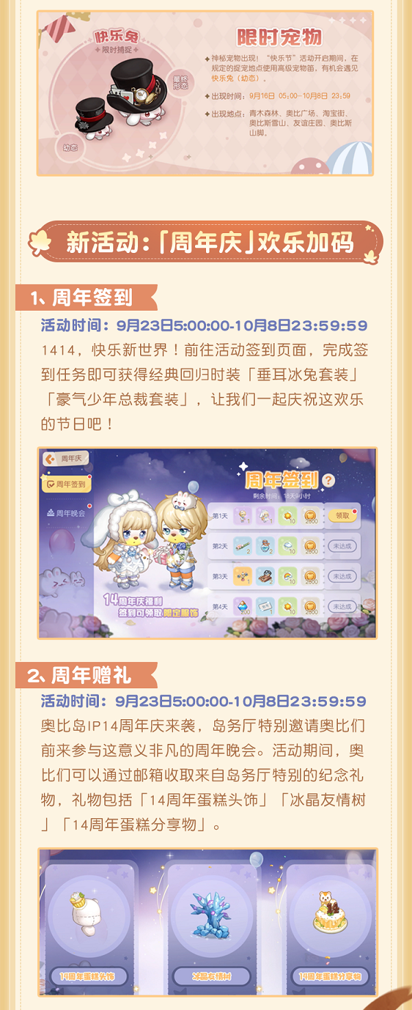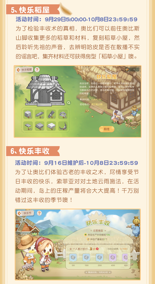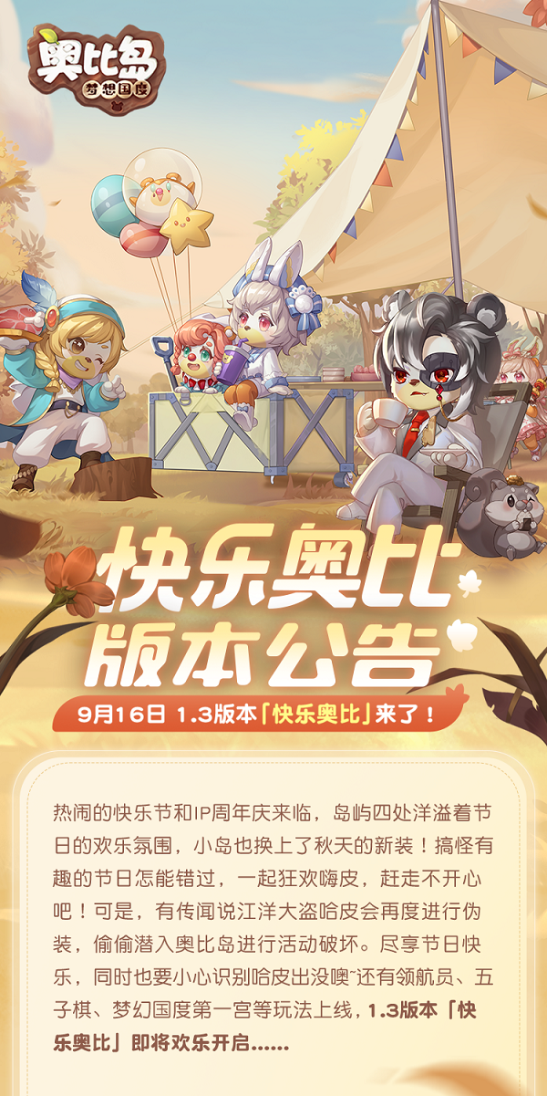 奥比岛手游1.3版本「快乐奥比」,将于9月16日欢乐开启!让我们相约「奥比快乐节」,一起迎丰收、打哈皮、开派对!