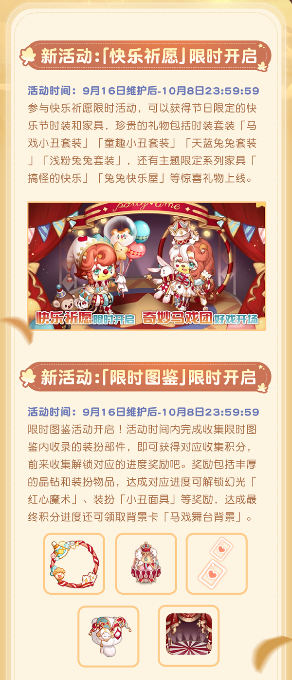 此外,全新节日限时时装「粉蓝兔兔套装」、「萌趣小丑套装」即将上线!梦幻国度第一宫也即将在9月17日正式开启。还有淘宝街道的五子棋双人小游戏,亲密度考核第四关,等你来挑战!