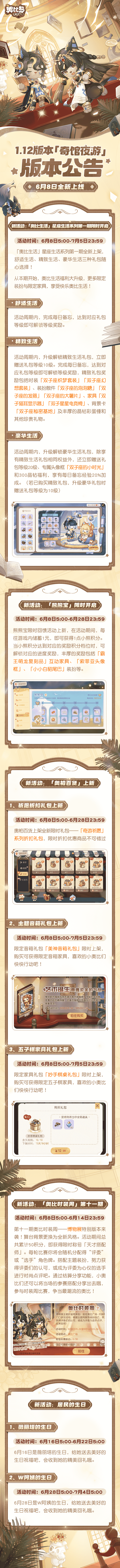 奥比岛手游1.12新版本「奇馆夜游」6月8日正式上线!「奇游夜」主题活动已开启,「奇游捕夏」、「奇游绘彩」等趣味新玩法也将上线,更有奇幻博物馆主题时装&家具上新!限时宠物「哈尔勒斯」将出没海岛。前往「奇游商店」可以免费兑换全新趣味服装和家具。此外,小岛还将出现新的场景变化,唯美萤火虫幻境等你打卡!