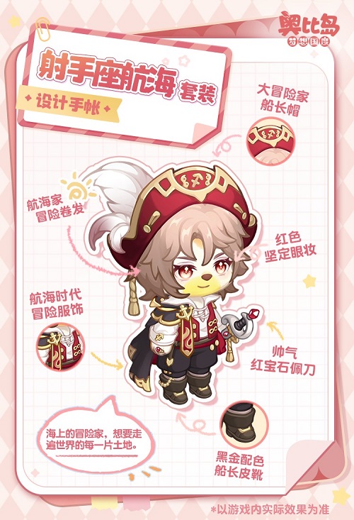 本次时装整体以热情耀眼的金色、红色为主色调,在套装的发型、服装、首饰上均加入了具有射手座特色的符号元素,光辉弓箭、热情英气发型......彰显了射手座热情慷概、自信无畏的品质;冒险佩刀、航海披风......彰显了射手座崇尚冒险和自由的精神。此外,还有射手座主题同款家具,射手座冒险之船、瞭望台都象征着射手座的理想冒险世界。