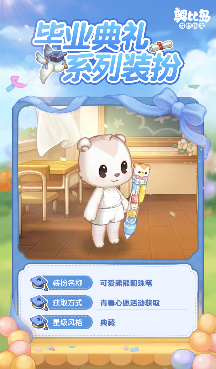 在绝版的限定夏日,把青春与梦想缠绕在一起,开启人生的新篇章!6月20日,「毕业季」限时活动开启,来参加一场特别的毕业典礼吧!参与「毕业季」限时活动可获得活动限定礼物,奖励包括「可爱熊熊圆珠笔」「青春少女音符眼」「音符猫耳发箍」「青春链条小马甲」「青春格纹蓬蓬裙」「甜酷吊带上衣」「阳光少年温柔眼」「阳光校园制服」「阳光少年运动鞋」等限定装扮,以及「毕业派对花束」「毕业派对地毯」「毕业派对纱窗」「毕业派对黑板」「毕业派对课椅」等限定家具散件,还有全新的头像框、背景卡、左装饰「青春心意书包」、双人座椅「趣味三角尺」和晨星品质称号等超多惊喜礼物!此外,在本次活动中完成全部物品收集的小奥比,还可获得限定装扮「空间开场(匆忙)」!