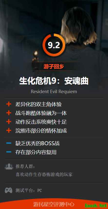 总评:《生化危机:安魂曲》将《生化危机2:重制版》所筑起的窒息式生存恐怖,与《生化危机4:重制版》所确立的动态动作元素,在同一部作品中完美地结合在了一起,是一部无愧于“系列集大成之作”称号的野心之作。格蕾丝与里昂这对性格迥异的双主角制,营造出了恐怖与宣泄感之间的鲜明对比,并以极高的水准再次展现了“在紧迫局势中如何构建最优攻略路线”这一系列根源性的乐趣。