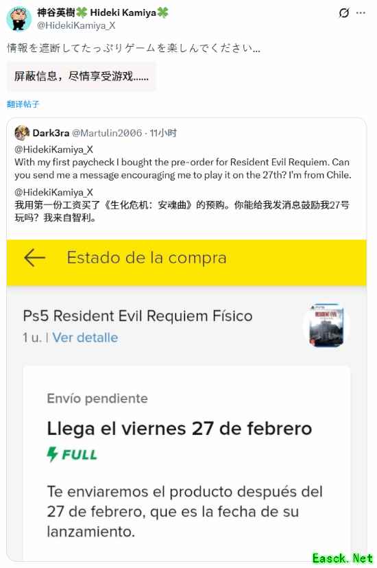 这位名为 @Martulin2006 的网友发文表示,自己刚刚领到了人生的第一份工资,并毫不犹豫地将其用于预购《生化危机:安魂曲》。为了纪念这一时刻,他特别喊话神谷英树,希望这位系列功勋制作人能给自己发一条鼓励信息,好让他能在2月27日发售当天更有动力开启这段恐怖旅程。