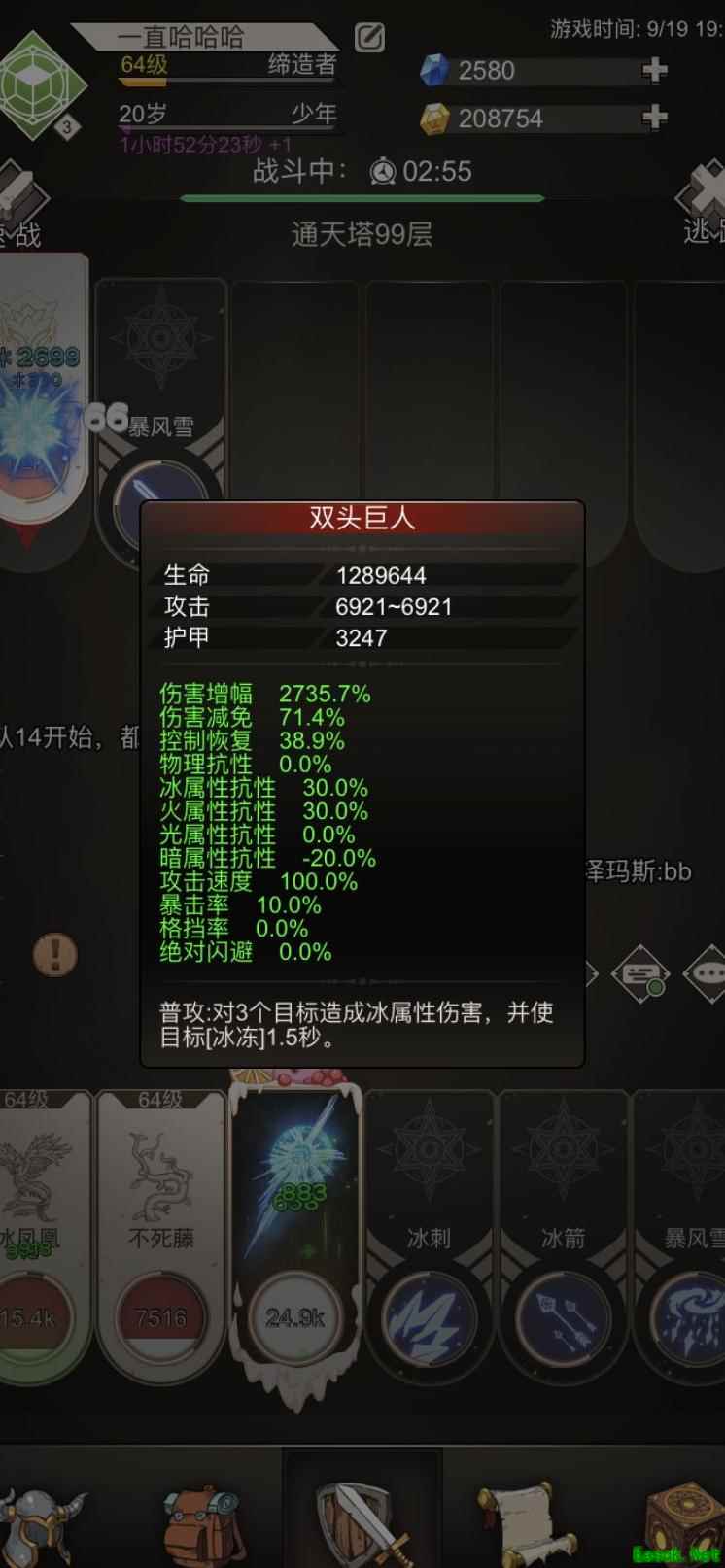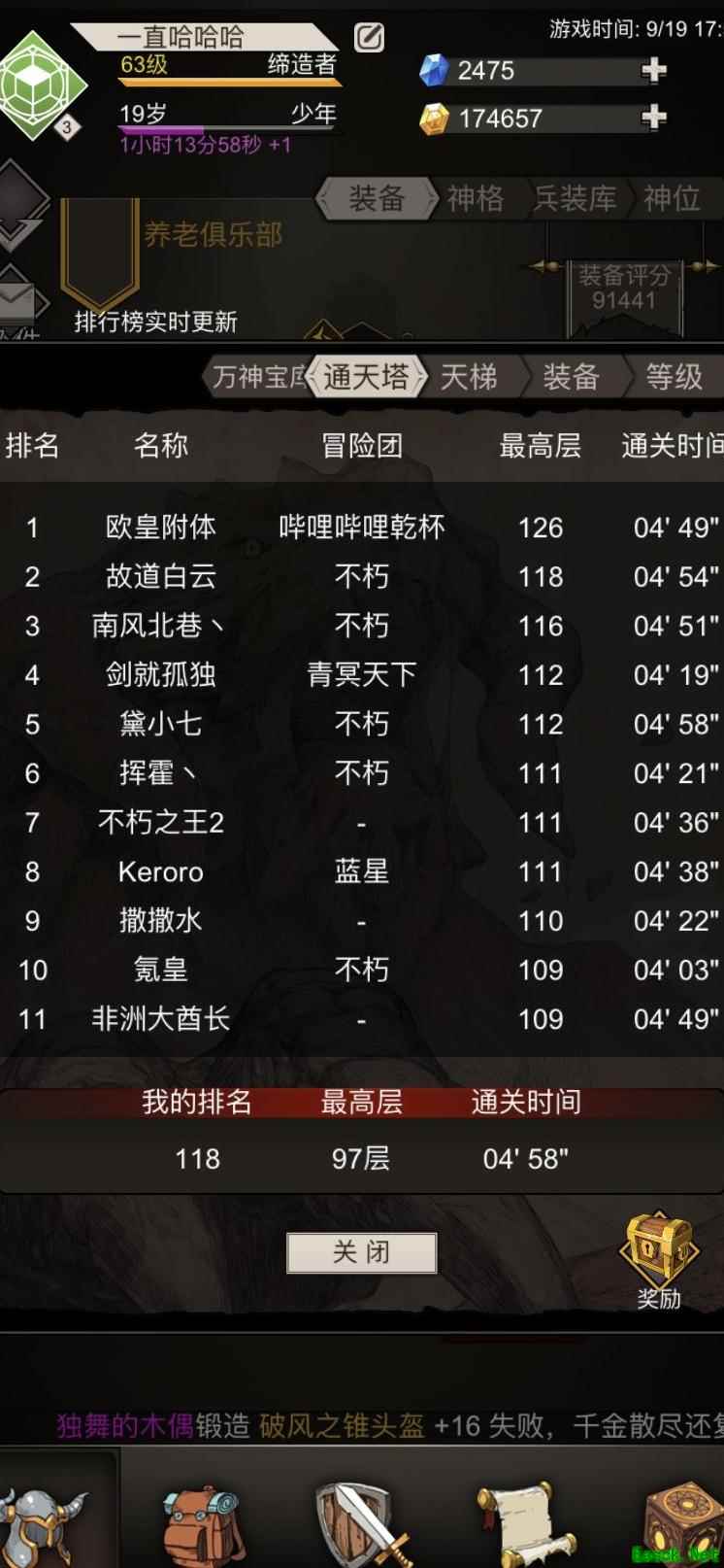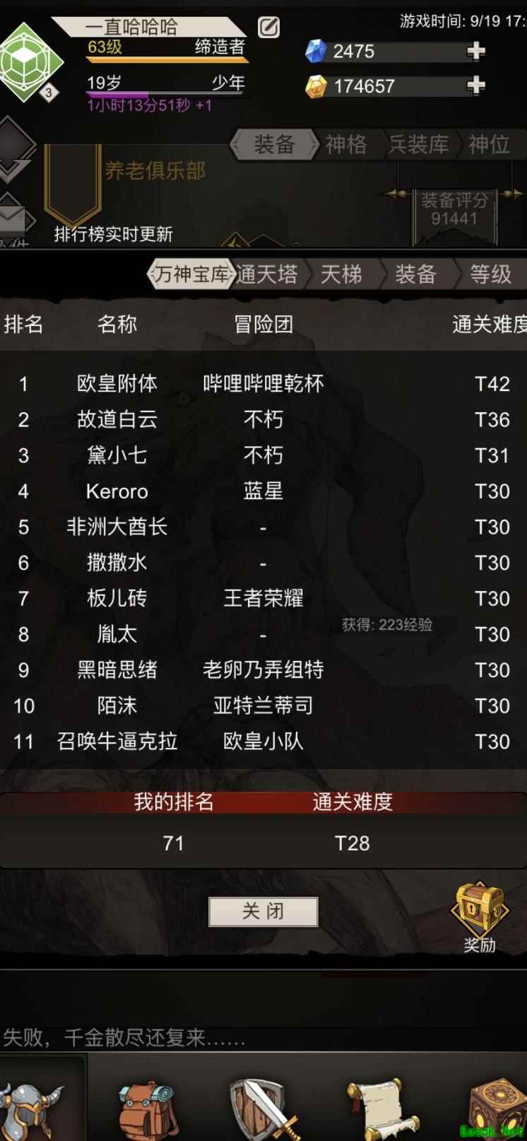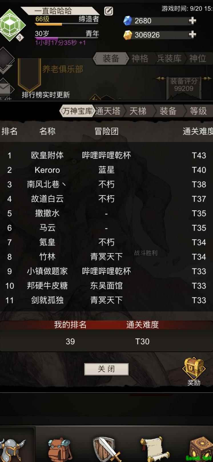 66级未换装备通关T30,本周万神殿上限为T30,正逐步扫荡。越10级挑战76级主线,生存能力较弱易被秒杀,但输出尚可。通天塔已达100层,面对多目标怪物时仍显应对不足,整体表现稳定但需提升抗压能力。