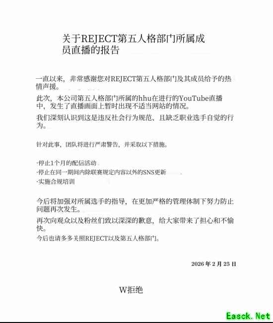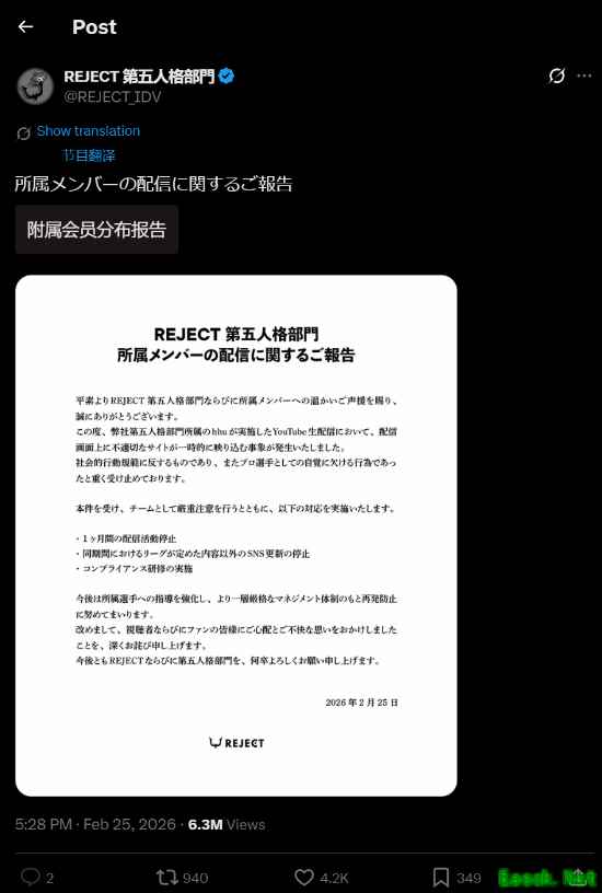 据yahoo新闻报道。日本电竞豪门REJECT战队于25日发布官方声明,就旗下《第五人格》分部选手hhu在YouTube直播中意外展示“不当网站”一事致歉。
