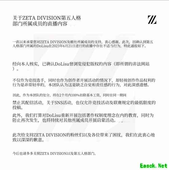 类似事件曾在2023年6月发生于另一战队ZETA DIVISION。当时ZETA在声明中明确承认选手浏览了“版权侵害内容”,并给予涉事选手停赛2个月的处分。