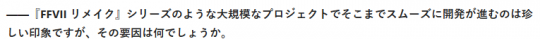 日前SE《最终幻想7重制版》第三部核心开发者接受采访,谈到了为何《最终幻想7重制版》第三部没有升级虚幻引擎5,这也是本作开发顺利的重要原因之一。