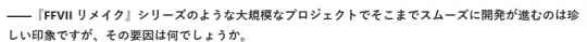 ·《FF7重制版》三部曲自立项至今已经过去了10年多,能够一直顺利推出的主要原因是团队对于开发引擎的熟悉以及对这部游戏史上最伟大的作品的尊敬态度所致。