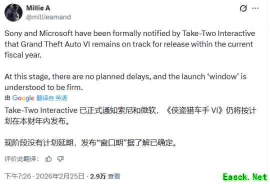 “索尼与微软已收到Take-Two的正式通知:《GTA6》仍将在本财年内发售。目前没有任何延期计划,发售窗口已被视为固定。”在行业内,此类向主机厂商发出的通知通常被视为筹备工作的最后阶段——若存在较高的跳票风险,发行商不会向负责分销与营销的合作伙伴确认日期。