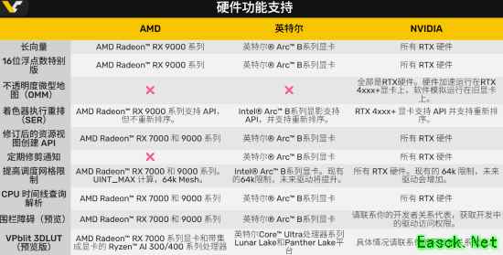 SER则是NVIDIA RTX 50/40系列、Intel Arc B系列硬件支持,AMD RX 9000系列只是支持API,但实际上没有重排序。
