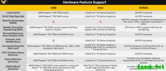 不同GPU对于DX12特性等级的支持存在很大不同,长向量、16位浮点等SM 6.9基础特性需要:AMD RX 9000系列、NVIDIA RTX系列、Intel Arc B系列。