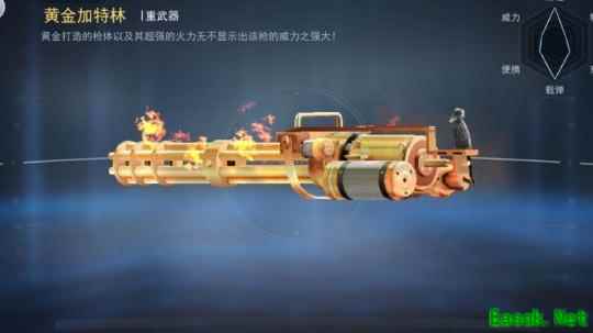 黄金加特林是加特林的强化版本,具备更强的伤害输出与更大的弹药容量,带来前所未有的战斗安全感与压倒性优势。