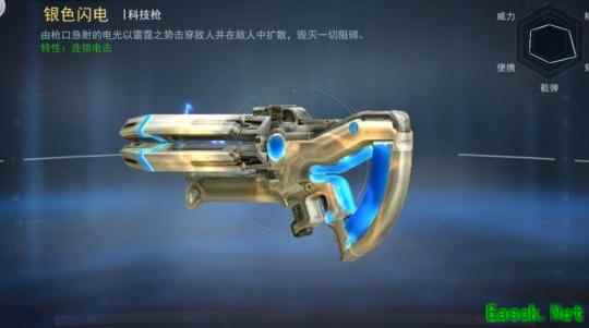 接下来介绍两款科技枪械,其一为银色闪电,发射的电流可迅速在多个敌人间传导,对群体目标造成高额伤害,是高效刷连杀和清理小怪的理想选择。