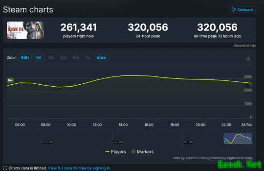 数据显示,《生化危机9:安魂曲》在Steam平台上的同时在线玩家数于发售首日达到32万560人的峰值。这一数据不仅使其成为目前该平台热度最高的游戏之一,也标志着《生化危机》系列在PC端的玩家活跃度达到历史最高点——相较于2023年发售的《生化危机4:重制版》(峰值16.8万),增幅接近一倍。