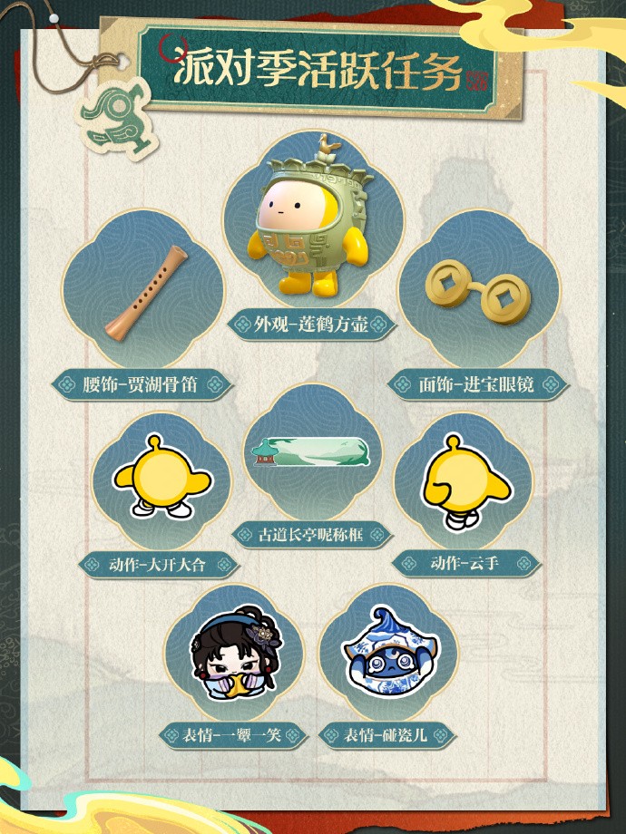“国宝归乡季”派对季活跃活动正式开放!完成全新派对季活跃任务,即可前往兑换商店获取稀有盲盒“莲鹤方壶”、稀有配饰“贾湖骨笛”、“进宝眼镜”,更有派对季限定全新表情“一颦一笑”、“碰瓷儿”,动作“大开大合”、“云手”,和“古道长亭昵称框”等奖励等待兑换。
