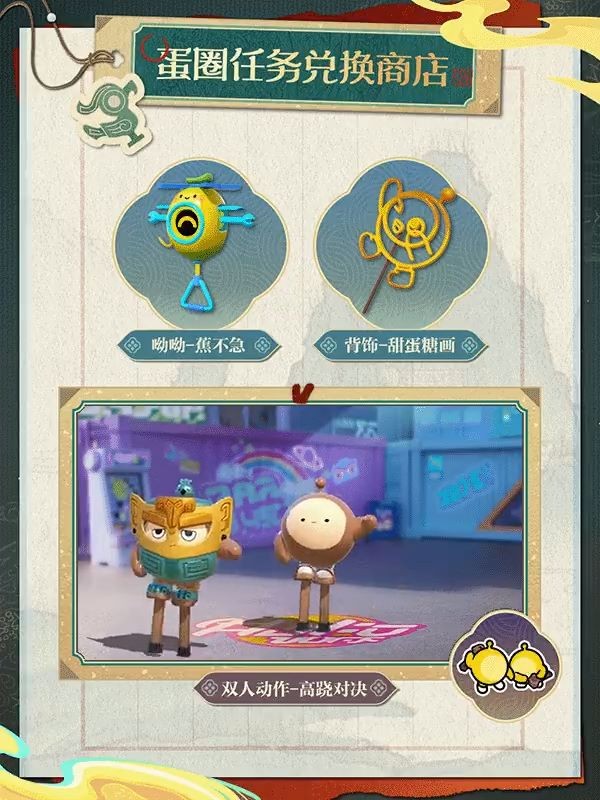 “国宝归乡季”派对季盛大开启,蛋仔们可通过蛋圈页面进入蛋圈任务,和蛋圈成员一起组队完成任务,即可兑换呦呦“蕉不急”、配饰“甜蛋糖画”和双人动作“高跷对决”!