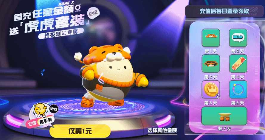 虎虎绝版套装也将在本次测试期间上线,首次充值任意金额即可立即获得【甩手舞】动作,在蛋仔岛开派对没有点新本事可不行!同时附赠签到7天首充奖励,签到7天可获得完整【虎虎套装】盲盒,全套时装都带有虎年元素,潮萌虎头帽、虎头鞋,一见钟情!【虎虎套装】盲盒数据也可以保留至公测哦!