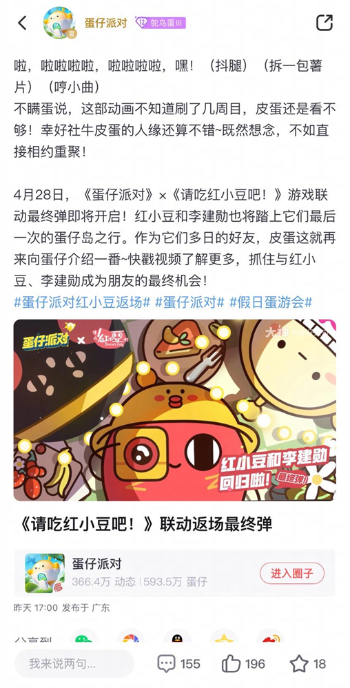 4月28日,《蛋仔派对》与红小豆游戏联动开启,红小豆和李建勋活力回归。现在上大神APP,戳视频即可了解更多红小豆与李建勋的故事。五一期间登录大神APP,即可参与红小豆精彩活动,赢取专属于你的丰厚奖励~
