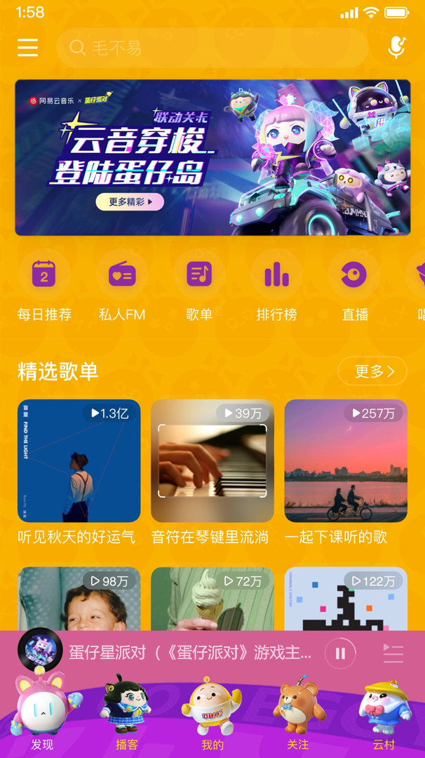 除此之外,解锁任意一种云村入场券都可获得网易云音乐蛋仔专属皮肤和头像挂件。经典蛋仔黄让人眼前一亮,背景暗藏小表情丰富的蛋仔们,萌动外观化身图标,让你的网易云音乐APP界面更加可爱。