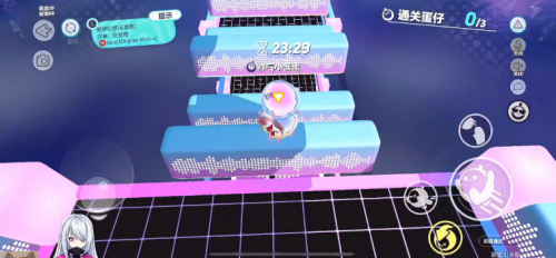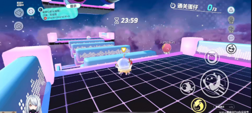 只见三人来到地图长跑酷地图“旋律幻想”,率先对左右滑动跳板发起了冲刺。这关对于“身经百战”的三人组只能说是毫无难度,不过接下来的第二关——销毁+走独木桥,就给三人前进的步伐带来了小小的阻碍。清严君和小染优先发起了冲锋,只见左右横跳之间,主打一个“蛋山无影脚”,不过都在离下一关只差一点的时候,无奈碰到销毁。好在多次尝试之后,两人也是发现了诀窍,卡稳了节奏,率先通关。果酱则是主打一个“天下武功,唯快不破”,瞅准时机,一个翻滚+连续跳跃,成功过关!看着近在咫尺的销毁,真的是忍不住替她捏一把汗!果酱,真·总是能带来惊喜的女人。