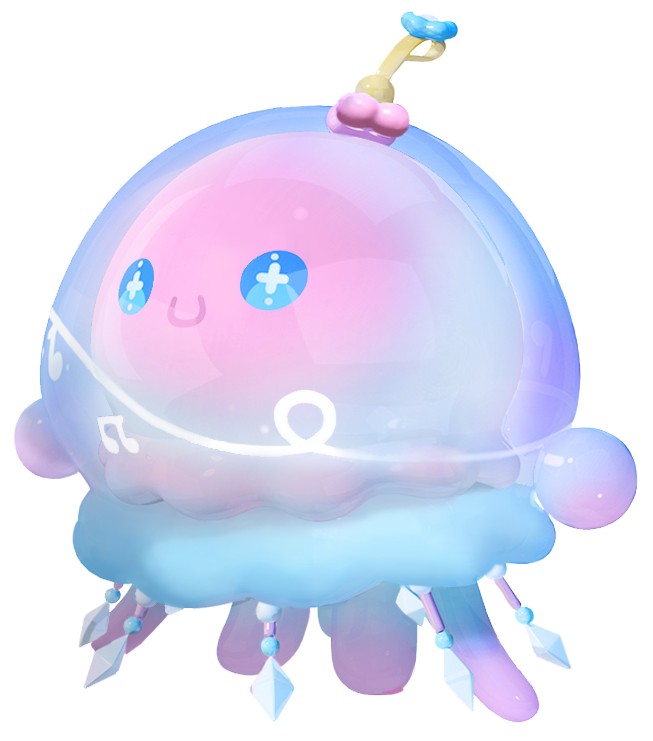天真乐观,神经大条的“水母尤莱亚”圆润可爱,紫色半透明的伞状体上点缀律动的音符,映出她微笑的面容,闪亮的蓝色星星眼萌力满分,头顶的风铃挂绳还点缀着繁花;柔软的触手用闪亮的珠串装饰,散发的光芒随着身体摆动,为清新可爱的她增添华丽色彩。