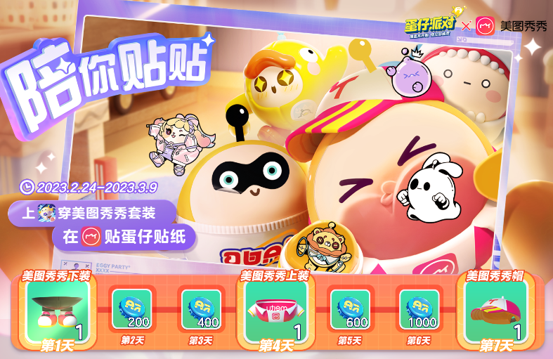 2月24日至3月9日期间,《蛋仔派对》X美图秀秀联动福利活动“陪你贴贴”限时开启!蛋仔们完成七日签到即可获得丰厚货币奖励,签到满7天即可免费获得酷炫的“美图秀秀套装”。