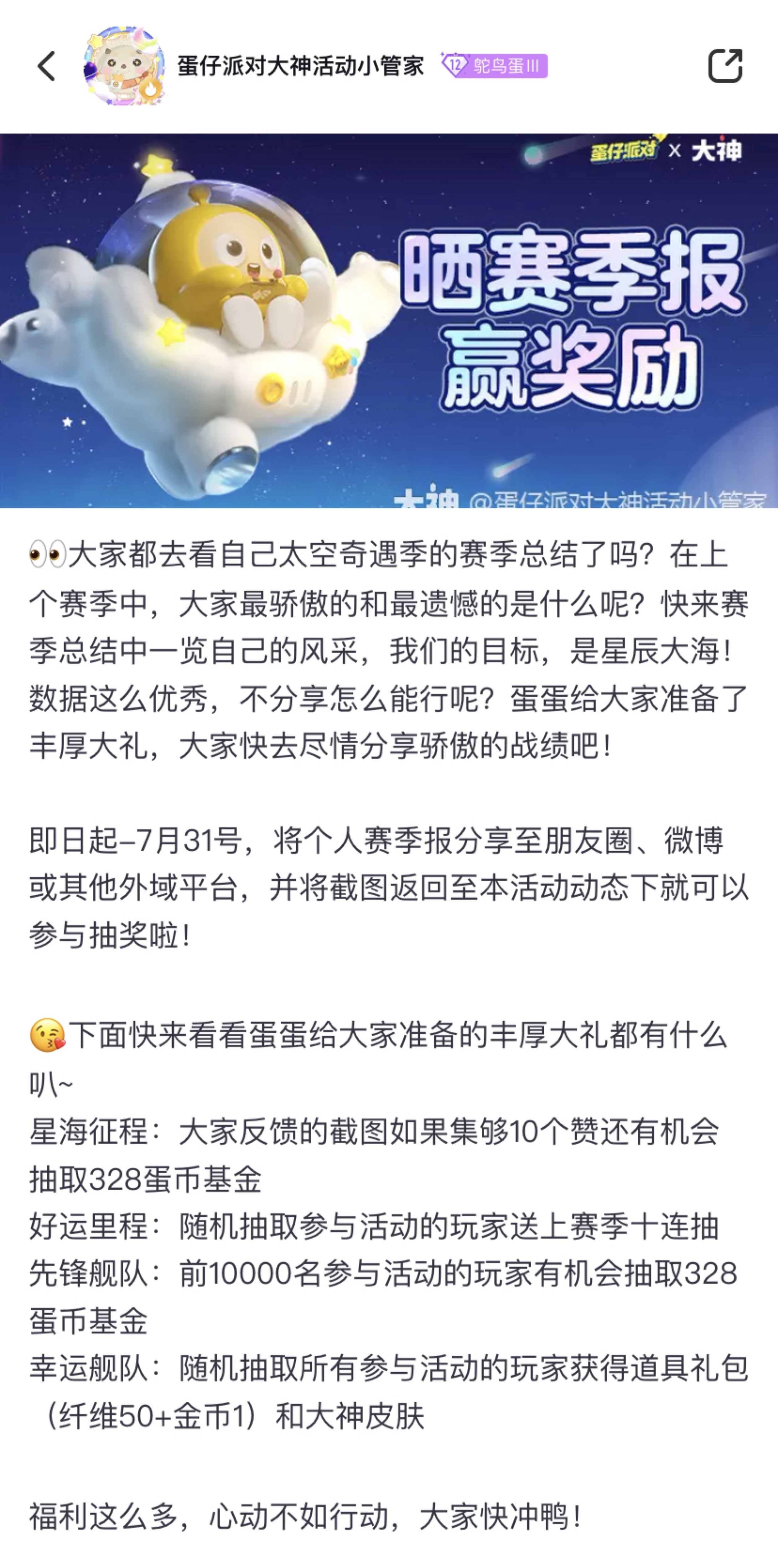 赛季的幸运之星锁定你,惊喜好礼即刻开启!7月31日前,上大神关注“蛋仔派对大神活动小管家”参与活动,将个人赛季总结分享至朋友圈、微博或其他外域平台,上大神晒出分享截图即可参与抽奖,参与活动即有机会赢取328蛋币基金,赛季十连抽,大神外观以及游戏道具奖励,欧气附体,好运连连的锦鲤蛋就是你!