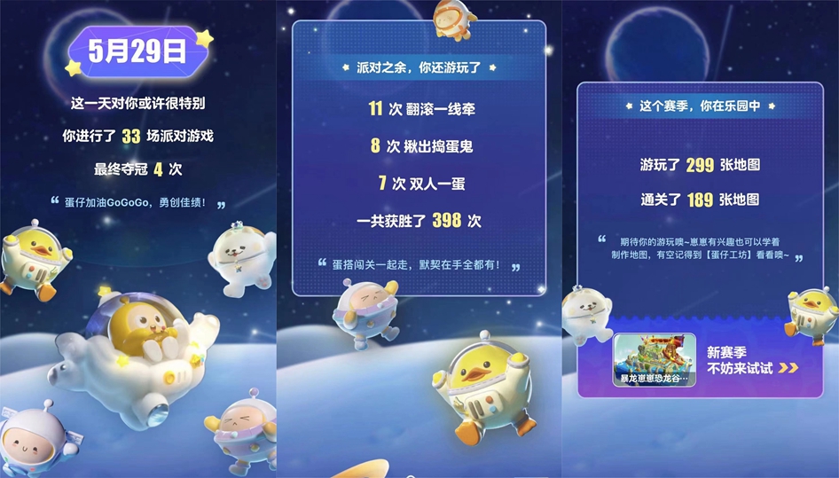 璀璨星河,治愈来袭~《蛋仔派对》新赛季【梦幻星遇季】如期上线!在上一个赛季中,大家跟随太空船长贝贝踏上了神秘的太空之旅,在这段星际旅途中,蛋仔们都有哪些难忘的回忆呢?太空奇遇季赛季总结新鲜出炉,快上大神搜【大神蛋】,一键查收赛季总结,领取你的专属赛季幸运星吧!