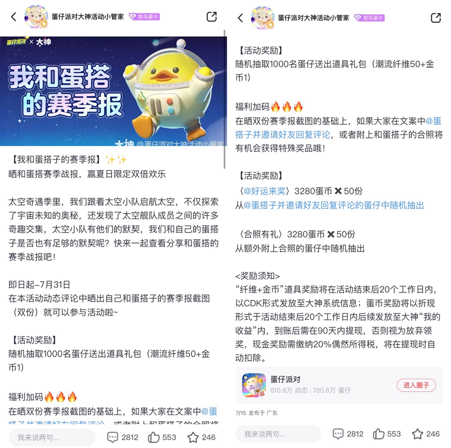 晒双份赛季总结,福利多多等你赢!即日起至7月31日上大神添加《蛋仔派对》游戏圈子,关注“蛋仔派对大神活动小管家”,参与【我和蛋搭子的赛季总结】活动,晒出自己和蛋搭子的赛季总结即有机会赢取金币及潮流纤维奖励,更有机会赢取3280蛋币,考验你和蛋搭子的默契时刻到啦,快上大神参与活动赢取好礼吧!