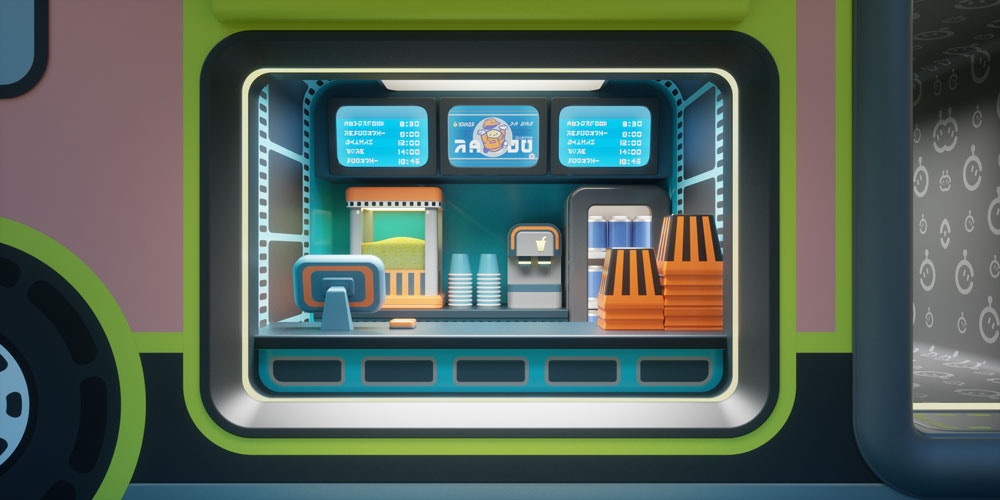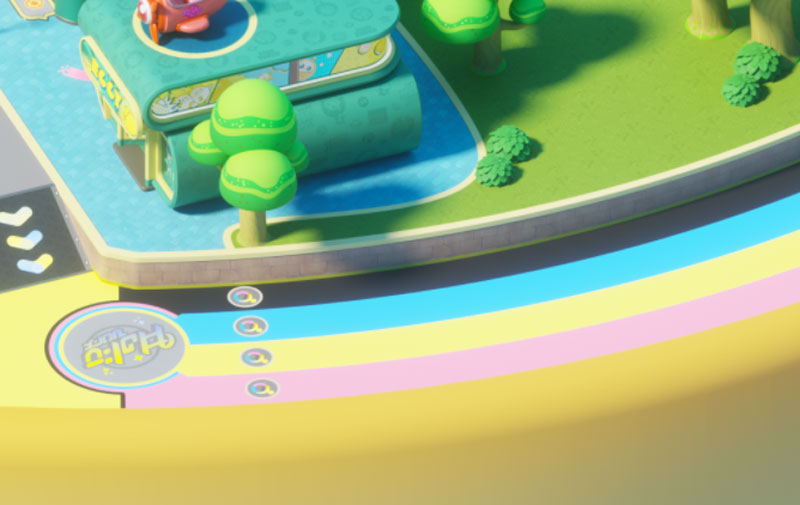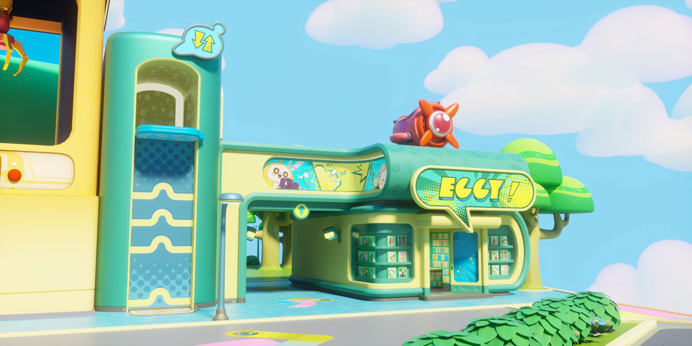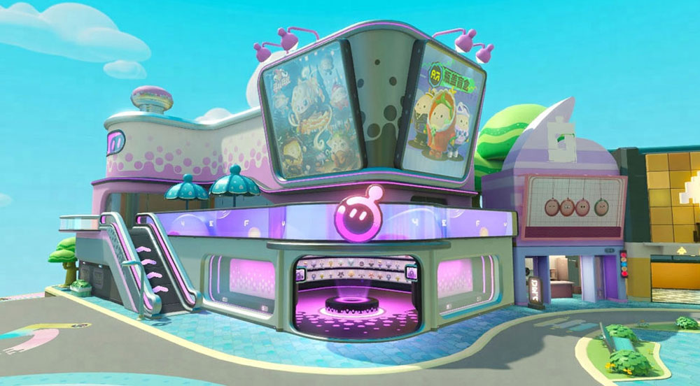 优雅梦幻的配色,圆润简约的线条,再搭配斑点图案,酷炫的装修潮流感十足。商店顶部巨大的电子屏幕正播送着蛋仔岛的最新时尚,而店内琳琅满目的盲盒墙更是极具视觉冲击,堪称弄潮蛋的快乐天堂!