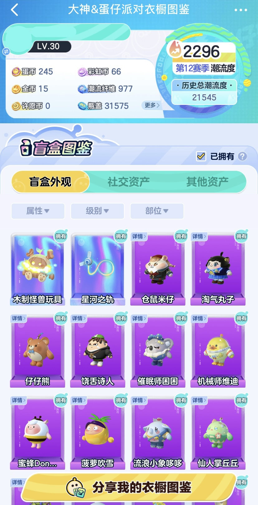 一键生成专属个人图鉴,多重惊喜好礼等你赢!在大神APP《蛋仔派对》圈子主页进入【衣橱入口】,即可查看账号内的盲盒外观、社交资产、其他资产等信息!珍藏外观一目了然,轻松查阅你的账号价值~