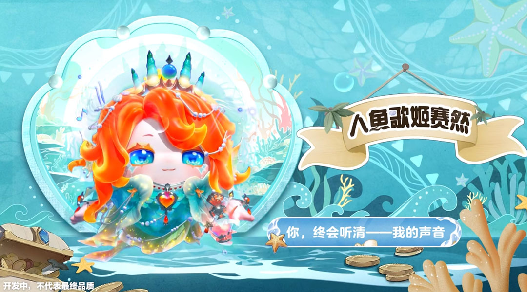 海藻一般飘逸的珊瑚红长发,装点着温润的海螺与珍珠;悦动的乐章与海水的波光交织环绕,将天籁般的歌声具象表达。飘逸鱼鳍抖落点点金粉,熠熠鳞片折射着海底微光,自浅绿到明黄渐变的鱼尾如同撒满落霞的粼粼海面,诠释着自然的瑰丽与美好。当空灵曼妙的歌声响起,群鱼游弋而来翩然共舞,人鱼歌姬赛然吟唱着那古老神秘的歌谣,“你,终会听清——我的声音。”