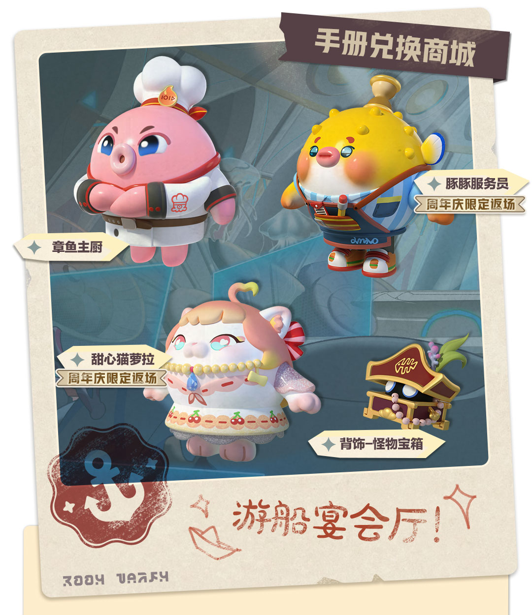 派对手册兑换商城梦幻焕新,典藏盲盒“章鱼章鱼”和典藏配饰“怪物宝箱”惊喜上架,同时典藏盲盒“豚豚服务员”、“甜心猫萝拉”也引来周年庆限定返场!黑帝斯号疑云重重,宴会厅更是卧虎藏龙。“章鱼主厨”一身洁白厨师服,四爪齐动快速出餐,以饕餮盛宴填满无穷无尽的欲望。而在默默无闻的昏暗角落,“怪物宝箱”悄悄掀起一条缝,邪恶的视线环顾四周,似乎酝酿起又一个阴谋。