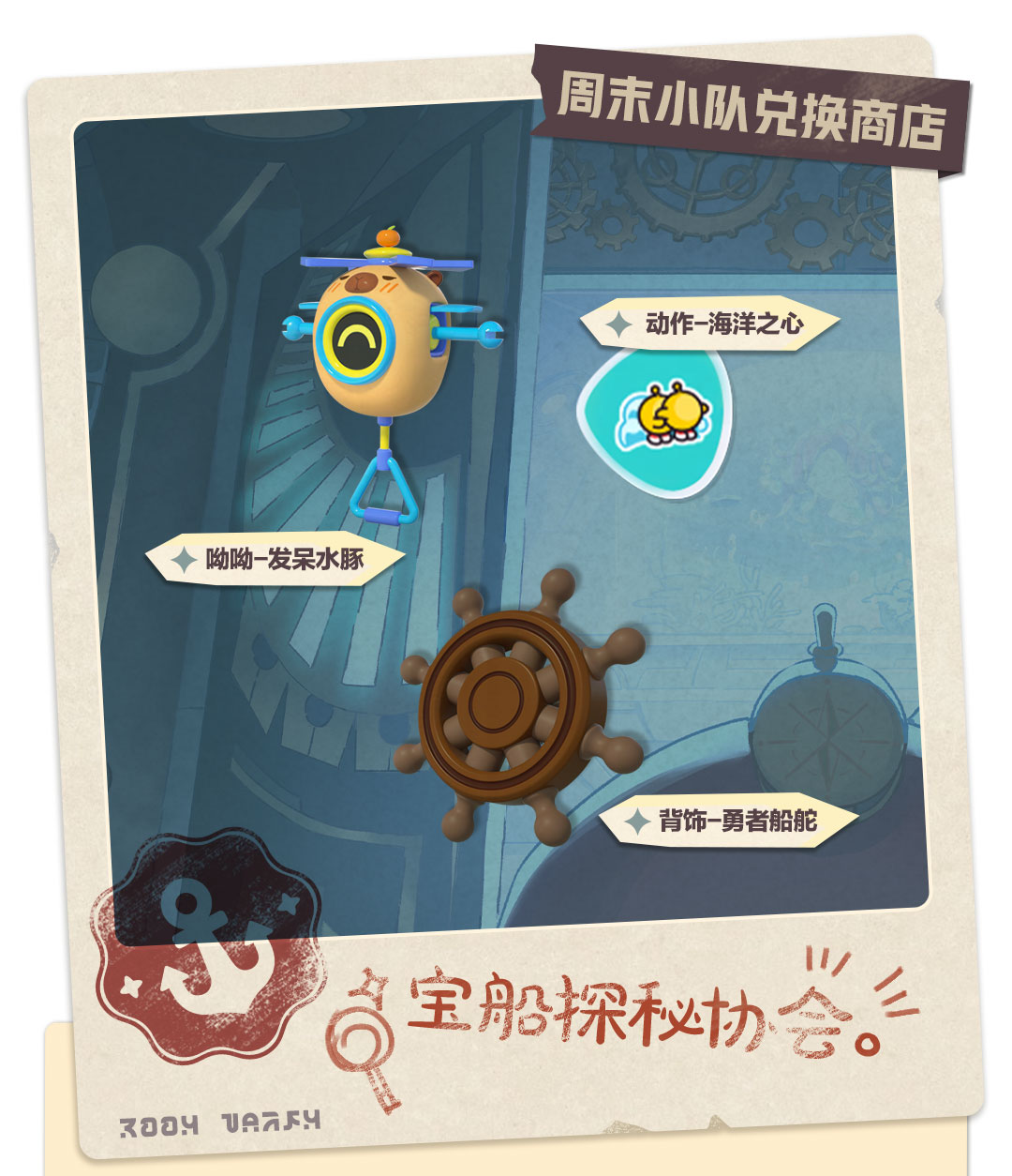 “潮玩大作战”派对季盛大开启,周末小队兑换商店也迎来了新朋友与新惊喜。集结周末小队,完成活动任务,即可获得呦呦“发呆水豚”、配饰“勇者船舵”和双人动作“海洋之心”!