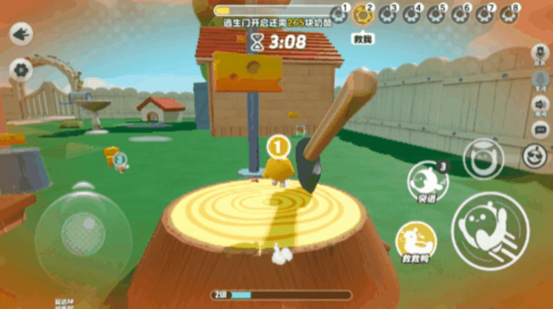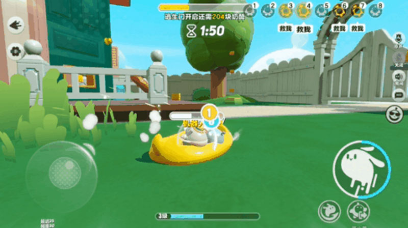 在鼠方阵营的职业能力强化中,技能“救救鸭”也是一种强力的救援手段。当鼠方蛋仔使用后该技能后,将坐上附带加速的“救救鸭”前进,在此期间若接触到泡泡状态的队友,即可将其直接拉上“救救鸭”且同步实施救援!