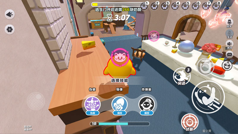 在游戏开始时,若被随机分配至猫方阵营,可在职业能力强化库中选择该局对应的核心技能。可选择的职业技能包括导弹、平底锅、伪装、炸弹崽四种,巧妙运用不同技能,击倒四处捣乱的老鼠们,保卫美味的奶酪吧!