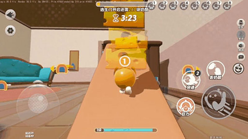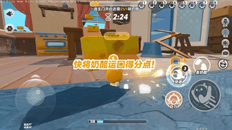 搬运能手快行动,利用“突进”和“跳跃”即可跨越地形与场景,迅速收随机分布的奶酪!当鼠方蛋仔靠近奶酪时即可自动举起,每次可同时搬运多个奶酪;当举起奶酪数达到10个时还会自动合成大奶酪,同时收集可获得的分数翻倍!
