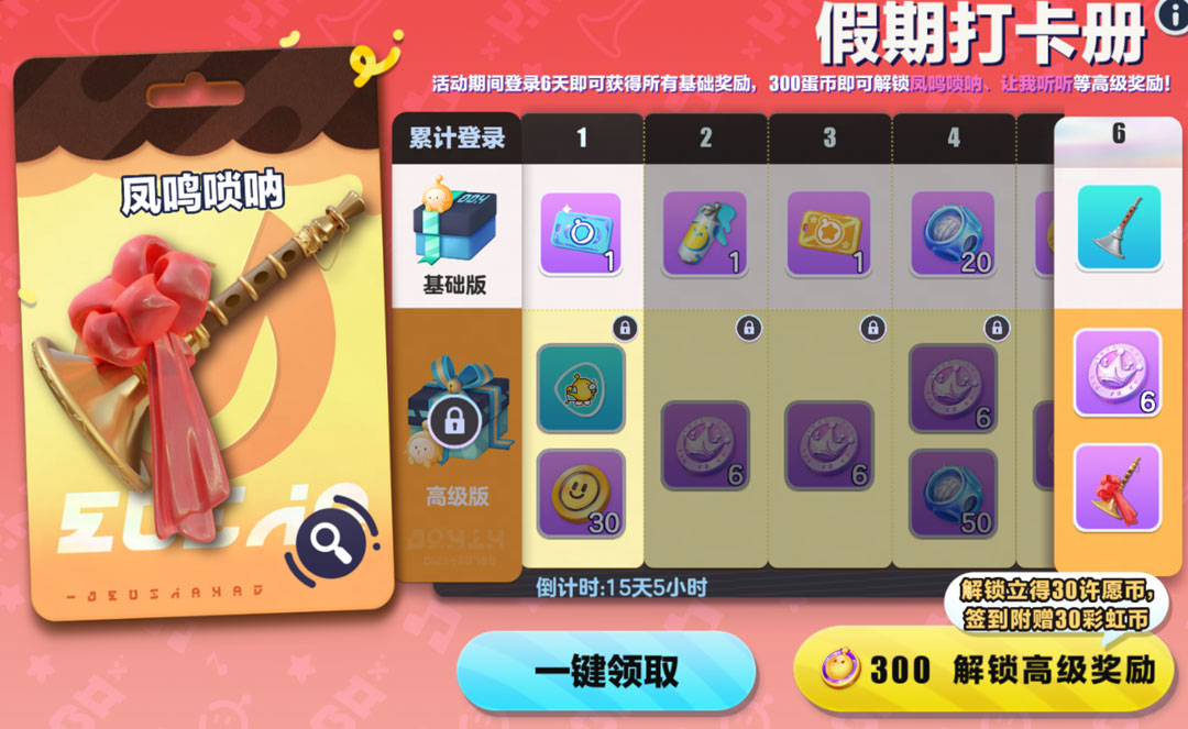 4月30日起,五一打卡册惊喜上线,蛋仔们累计登录7日即可免费领取众多道具好礼与全新乐器“唢呐”!购买解锁高级版打卡册,完成打卡还可额外获得30彩虹币、30许愿币、动作“让我听听”和典藏版乐器“唢呐”!