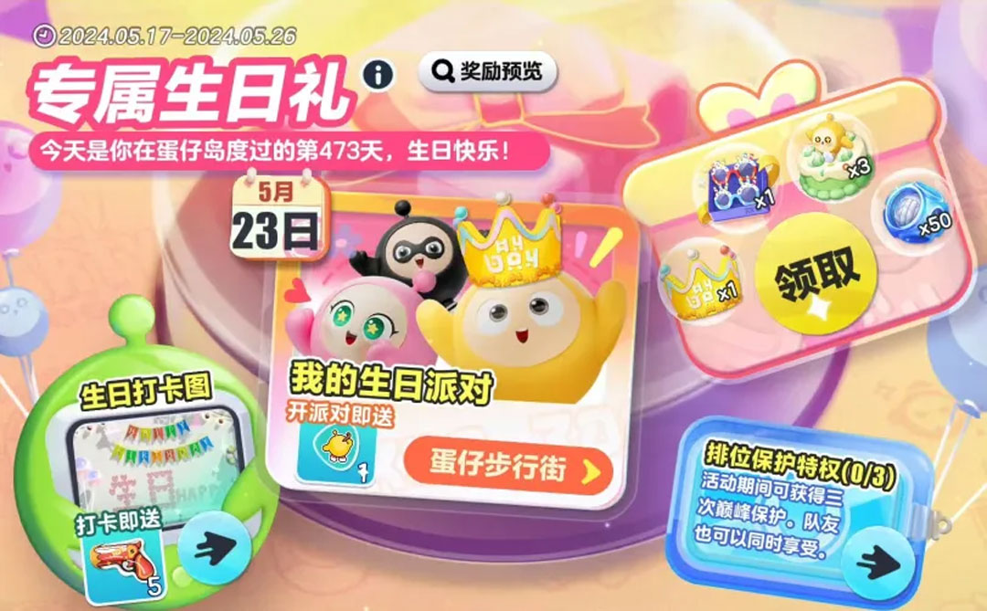 作为蛋仔岛最闪耀的生日主角,仪式感氛围感统统不可少!以主页设置的生日日期为准,蛋仔们在生日前6天至后3天期间登录游戏,即可参与【专属生日礼】活动,免费领取限时玩具“寿星王冠”、“生日眼镜面饰自选宝箱”、“青提奶油蛋糕”限次玩具等多重生日福利!更有3次排位保护特权,组队队友可同时享受巅峰保护,陪伴寿星蛋一同庆生!