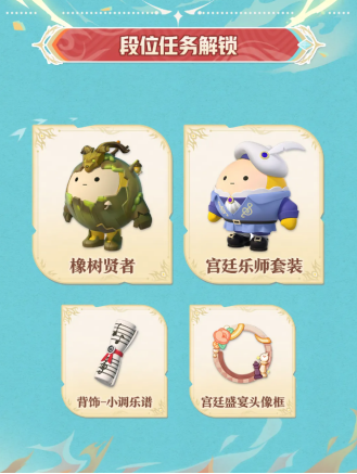 “龙与剑之诗”派对季开启后,游戏将根据段位继承规则对玩家段位进行降级继承。与此同时,新派对季的开启也带来了新的段位任务,完成指定任务,即可领取外观“橡树贤者”、 宫廷乐师套装”,配饰“小调乐谱”,及“宫廷盛宴头像框”等丰厚奖励!