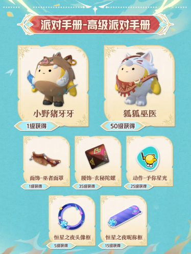 将派对手册升级为高级后,还能获得总价值3288蛋币的超值奖励。除了300蛋币、30彩虹币、20盲盒染色剂、20配饰染色剂外,还可获得稀有盲盒“小野猪牙牙”、典藏配饰“巫者面罩”、稀有头像框“恒星之夜头像框”、高级昵称框“恒星之夜昵称框”、典藏动作“予你星光”、典藏配饰“玄秘陀螺”和稀有盲盒“狐狐巫医”外观。