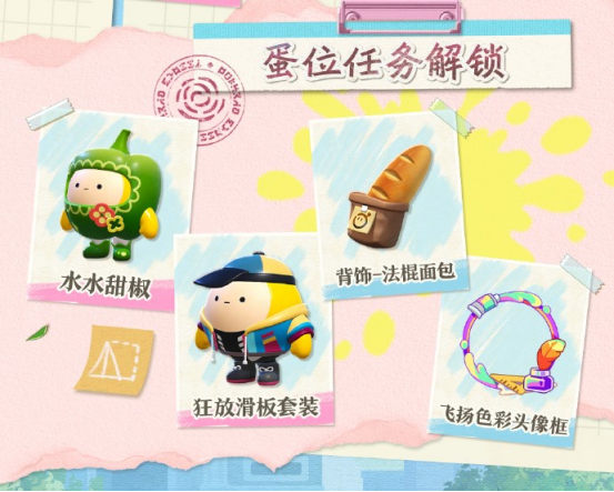 “绘梦校园”派对季开启后,游戏将根据蛋位继承规则对玩家蛋位进行降级继承。与此同时,新派对季的开启也带来了新的蛋位任务,完成指定任务,即可领取外观“水水甜椒”、 “狂放滑板套装”,配饰“法棍面包”,及“飞扬色彩头像框”等丰厚奖励!