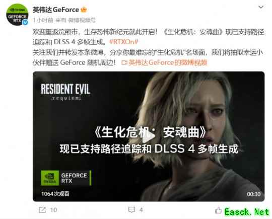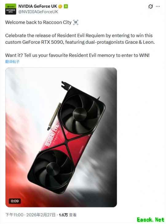 在《生化危机9:安魂曲》发售当天,英伟达英国官推在社交媒体上开启了一波《生化危机9》定制主题的RTX5090显卡抽奖活动。本次活动仅限一名中奖者。