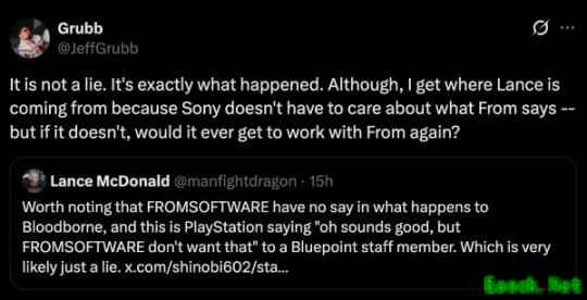 舅舅JeffGrub爆料,虽然PlayStation拥有《血源》的版权,但FromSoftware是PlayStation的亲密合作伙伴,索尼似乎更想和FromSoftware保持良好关系,所以尊重他们的意愿,不想得罪他们。