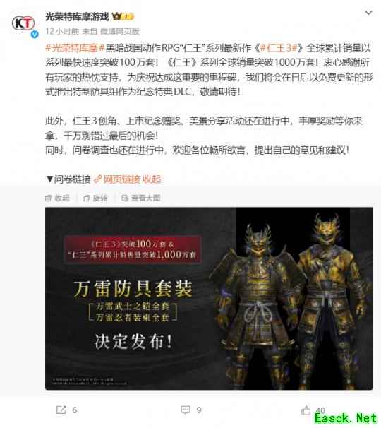 光荣官博宣布,为纪念《仁王3》全球销量以系列最快速度突破100万套这一里程碑,官方将在今后以免费更新的形式推出特制防具组,作为纪念特典DLC。