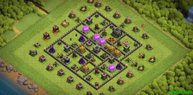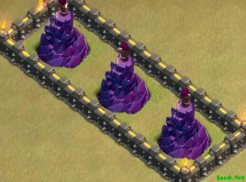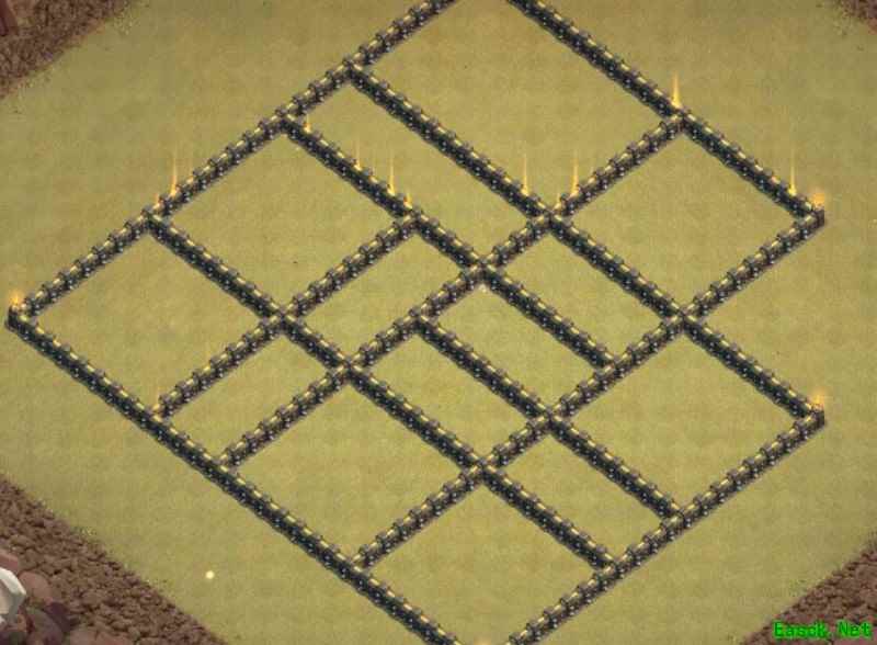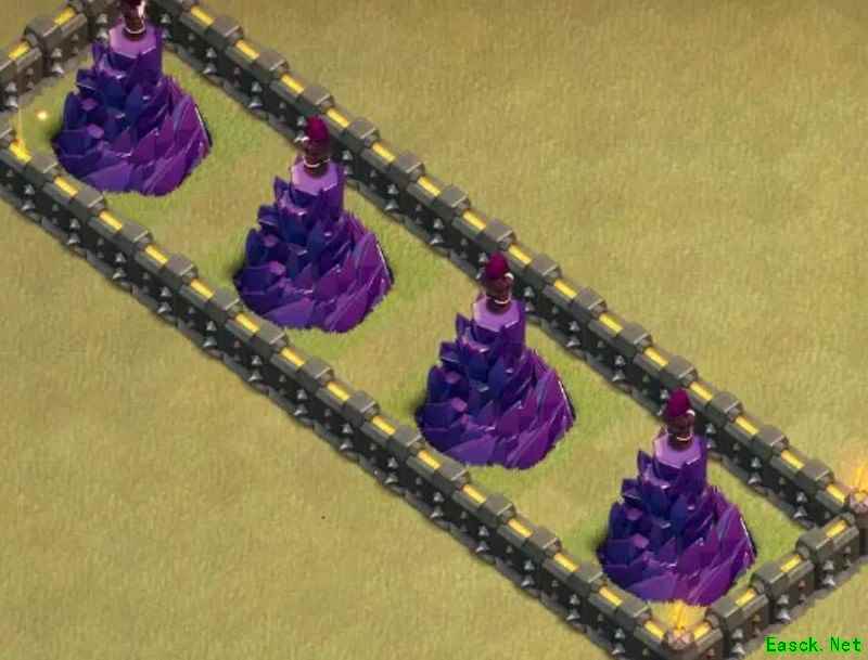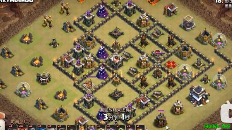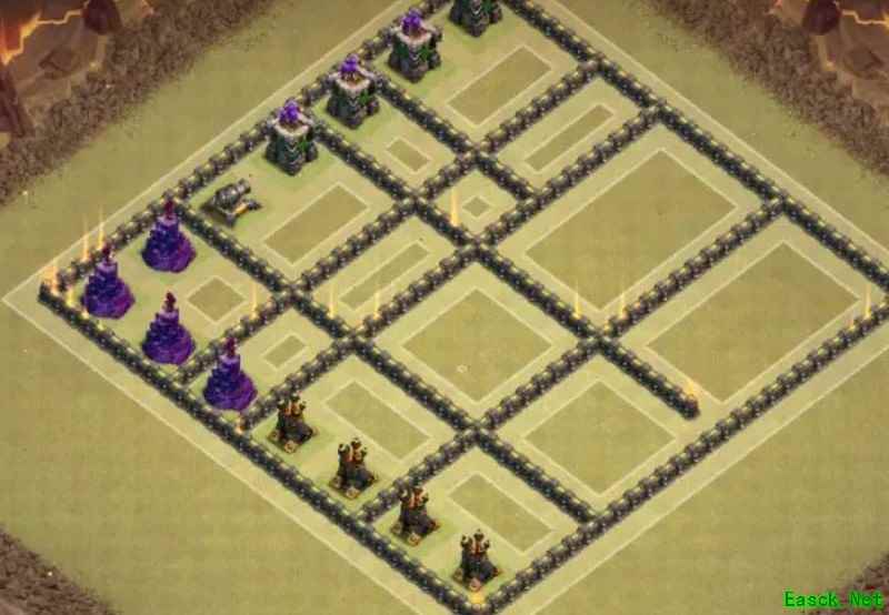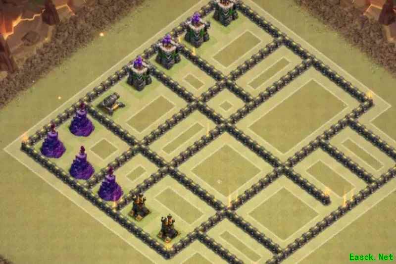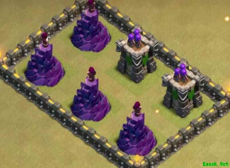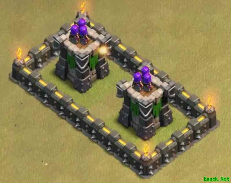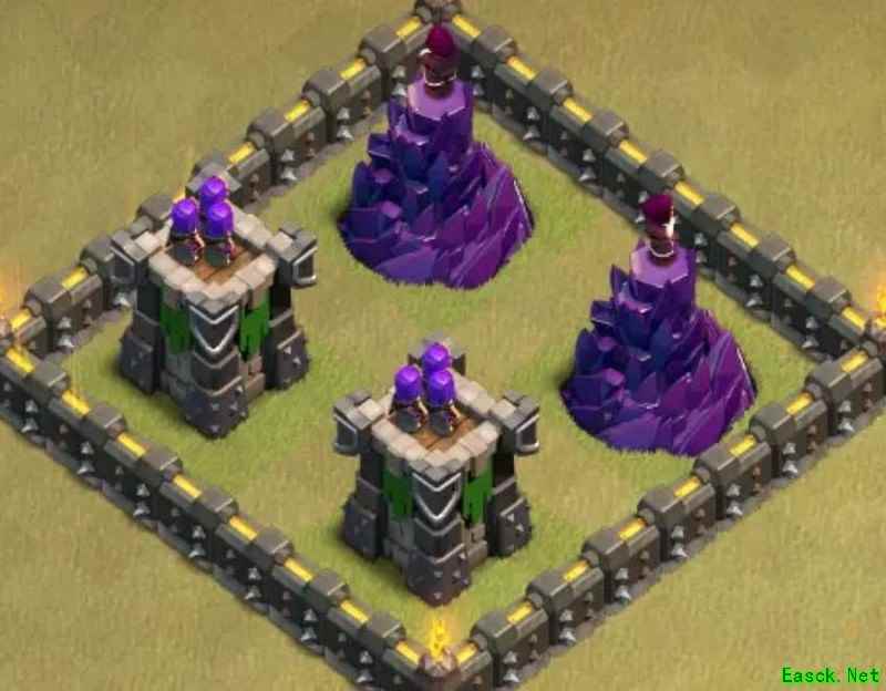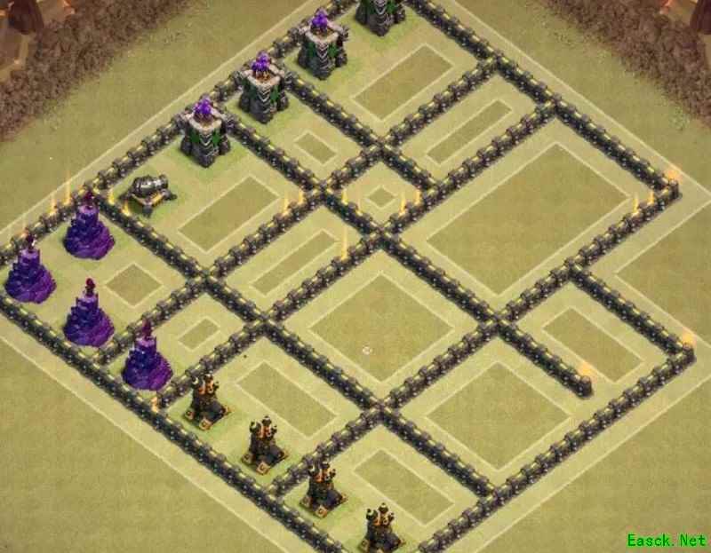 必须强调,九本唯一可行的布局就是格子阵。其他如引导阵、开口墙、回字阵或套用高本框架的设计我都坚决否定。九本与高本差距显著:缺乏核心防御、火力不足以剿灭天女,且引导设计极易被炸弹清除,等于白送给石头法师破阵。其余弊端不再细说,我曾尝试套用高本结构,最终以失败告终。