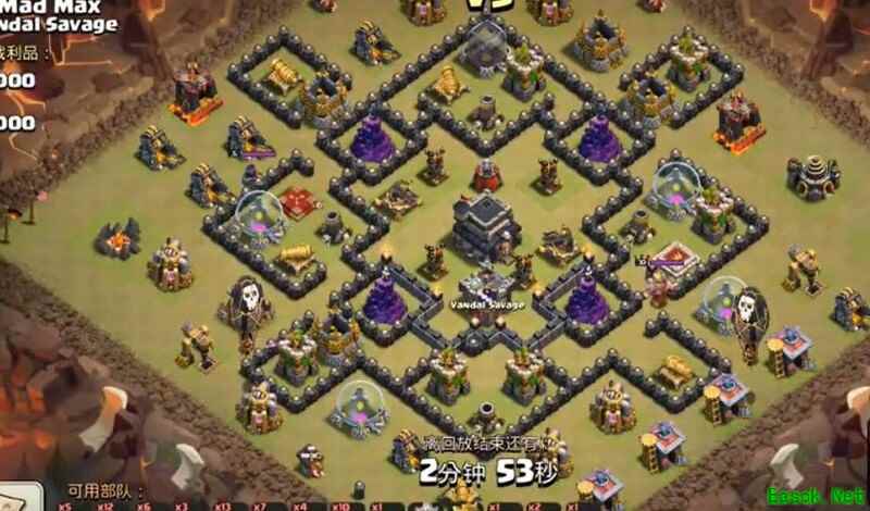 2017年的混合防御阵型,主要用于防范狗球与蓝胖进攻,此时部落战阵与村庄阵已明显区分,大本营仅血量较高,实际作用不大,部落战布阵核心在于防止被三星。