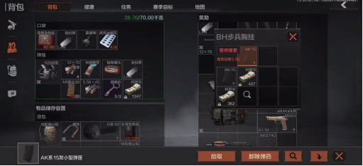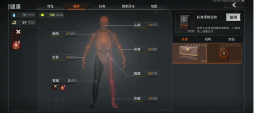战斗部分,《暗区突围》为了让战斗更加真实,界面中没有常规FPS的小地图、同时枪械也是没有准心的,换弹也需要有前置的压弹操作,背包容量需要合理分配,角色的身体也分成了多个部分,每个部分在受伤之后,如果没有及时治疗还会带来不同的负面状态,比如手受伤了会影响持枪的稳定性,腿断了会降低移速等等。